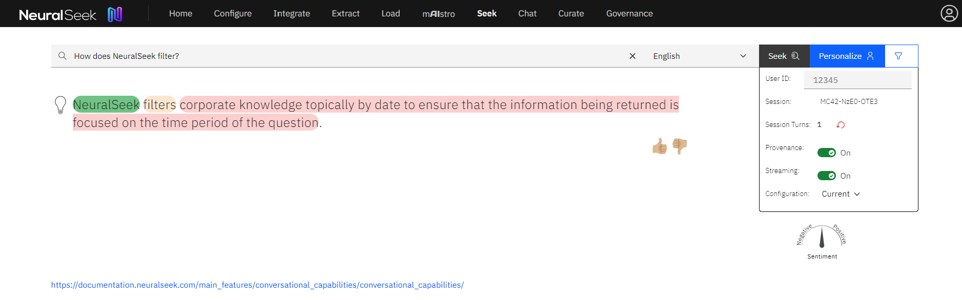 "How does NeuralSeek filter?" - View the output below.
