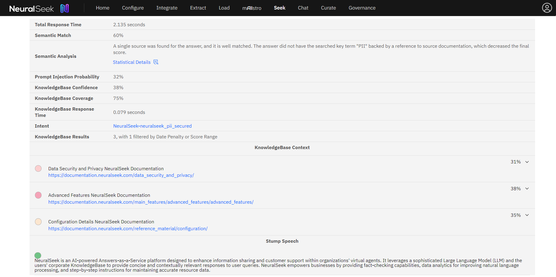 "How is PII secured by NeuralSeek?" - View the output below. The top 20% of our top scoring documents for this query were sent back for answer generation.