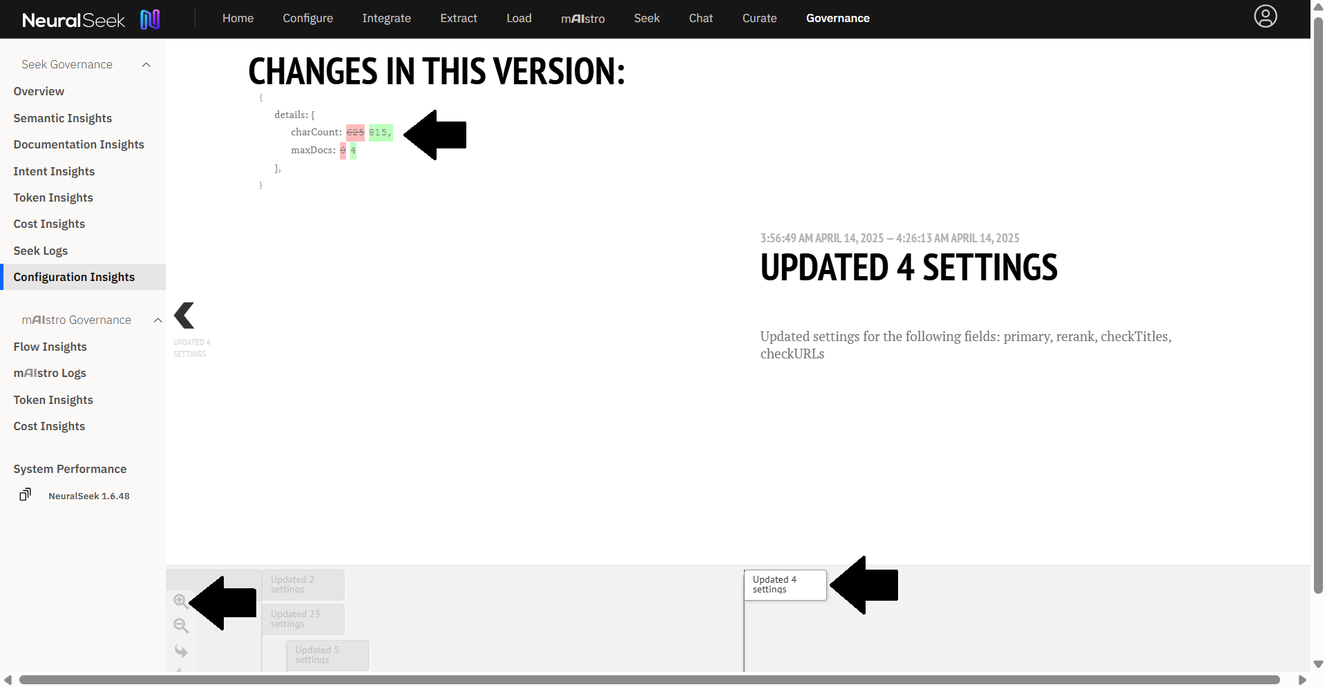 Configuration Insights. Here, we can review each version of our NeuralSeek configuration containing the different changes made during the NeuralSeek tuning steps. - Click on a version to show the modifications made in the Configure tab.