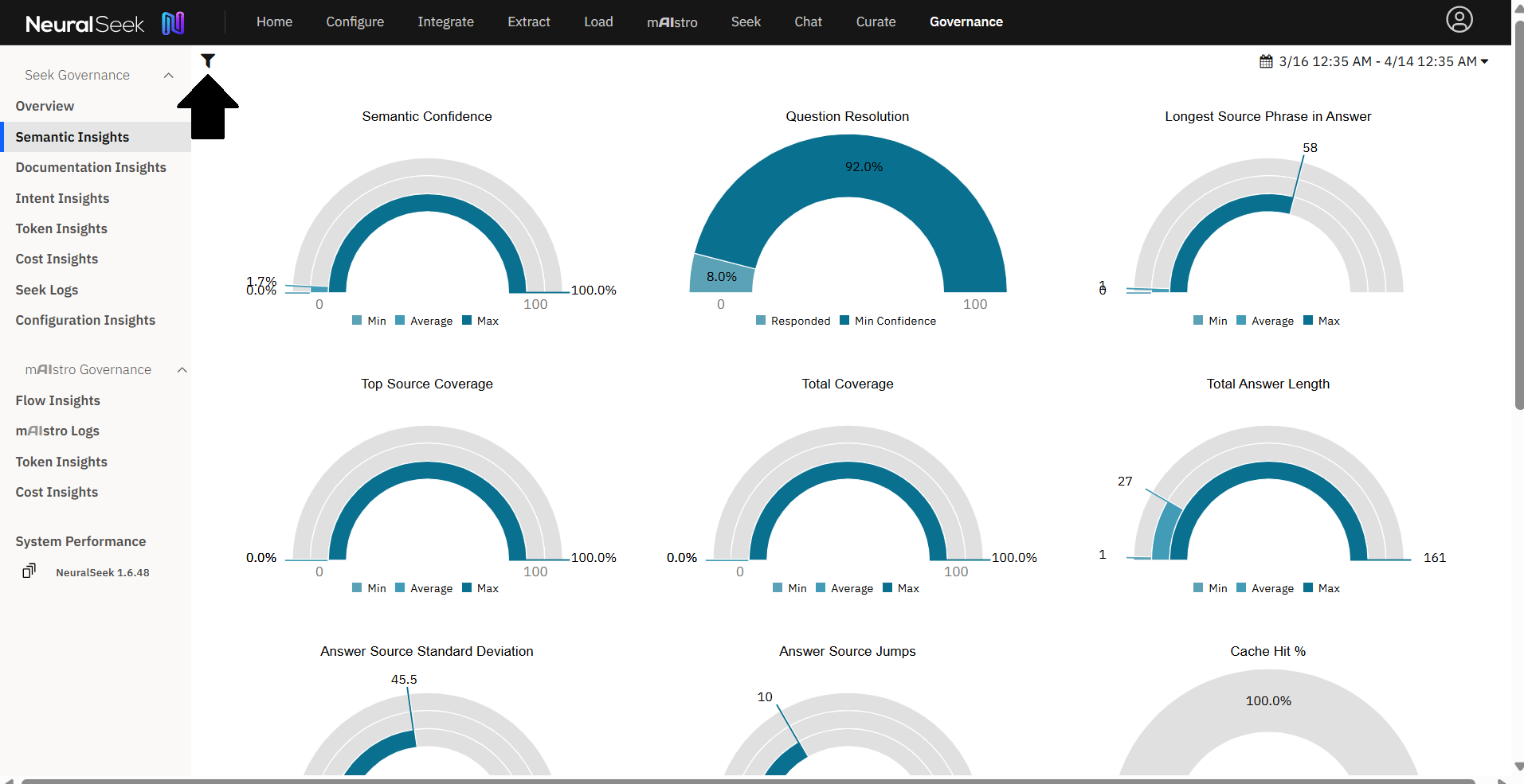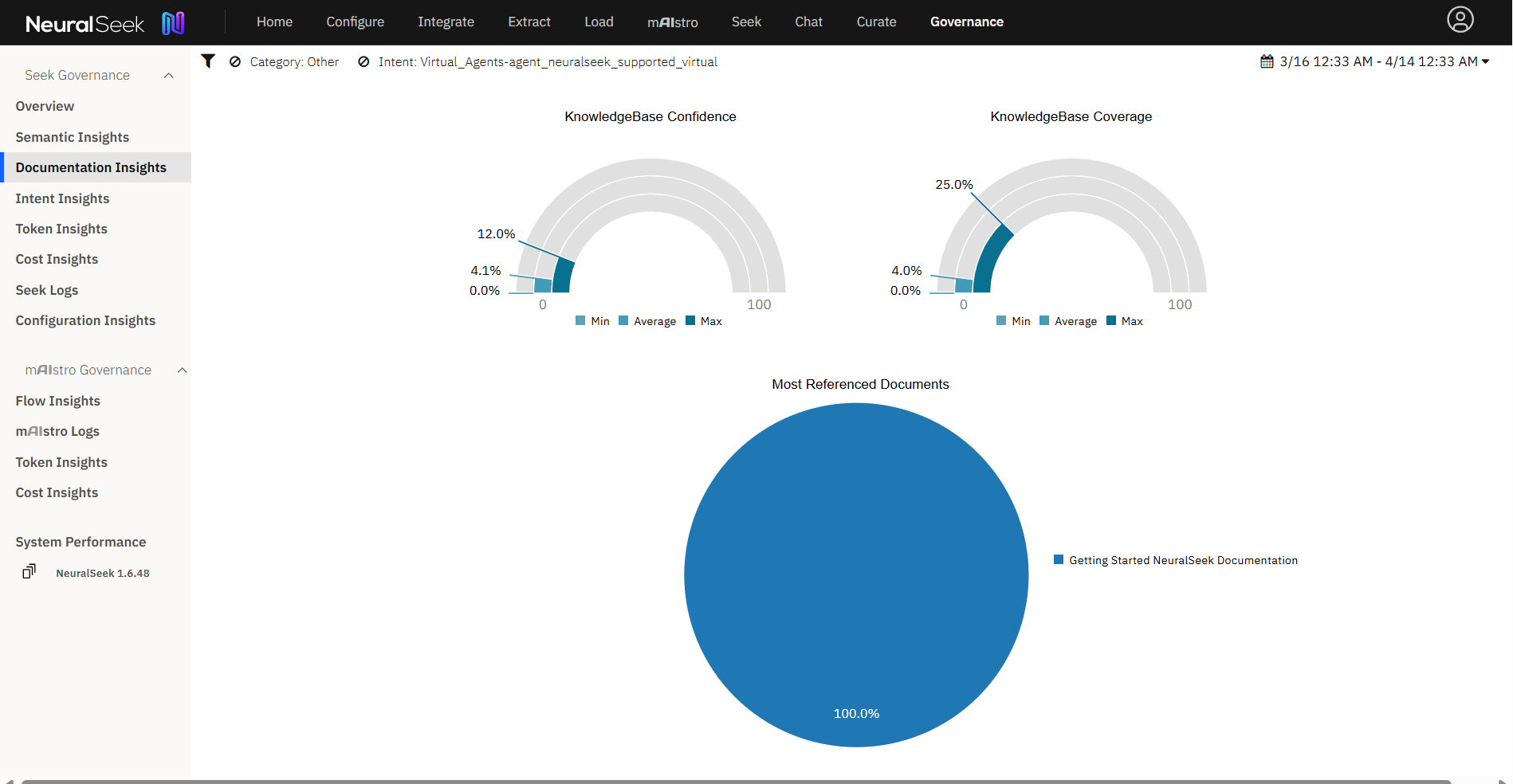 NeuralSeek's Governance tab serves as a centralized platform where users can access various insights and metrics related to the governance of their NeuralSeek system.